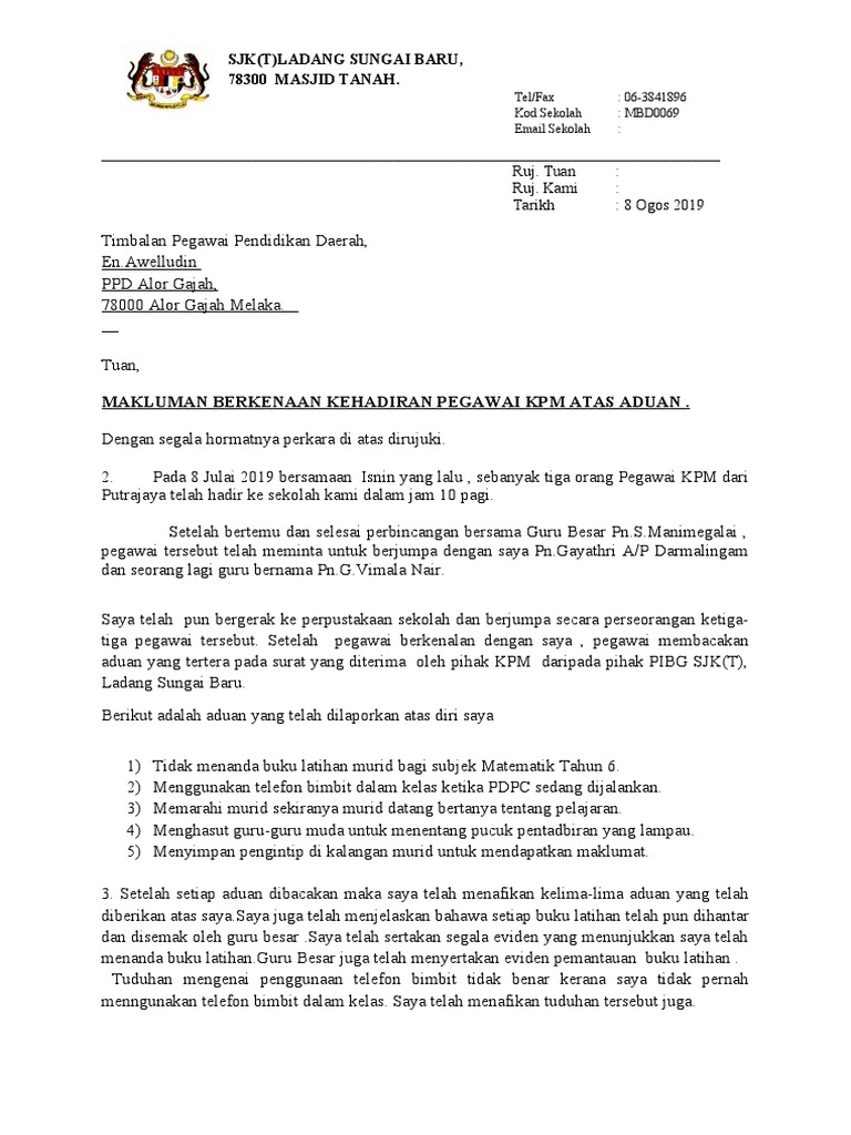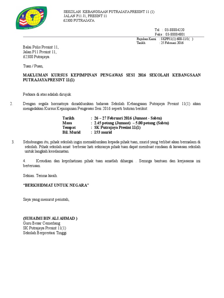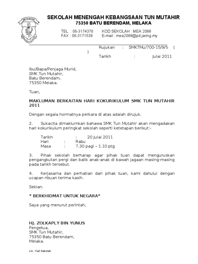 The assortment of images Contoh Surat Makluman Aktiviti Kokurikulum Kepada Ibu Bapa that are elected directly by the admin and with high res HD as well as facilitated to download images. 03-20316418 _____ Waktu Perkhidmatan Pejabat. Berikut ini adalah contoh surat rekomendasi kepala sekolah atau pengawas sekolah.